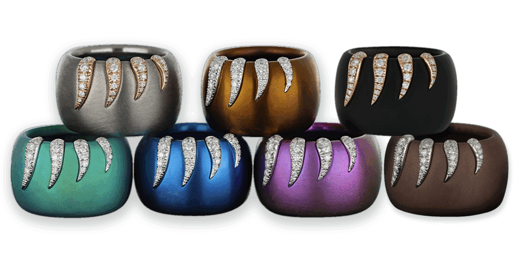 Anelli in titanio Grigio, Lilla, Bronzo, Verde, Blu, Marrone e Nero, diamanti, riporti in oro rosa 18 kt, oro bianco 18 kt, diamanti.