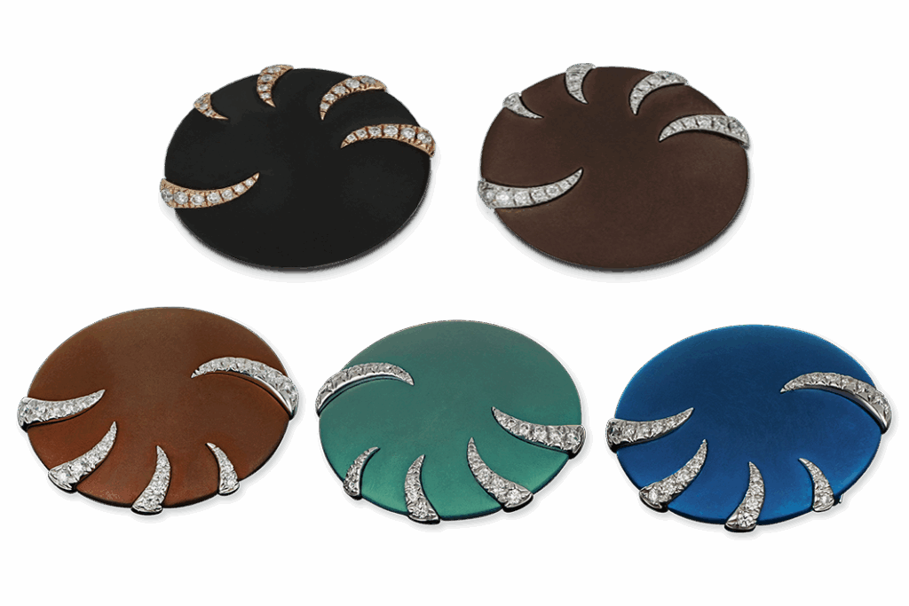 Orecchini in titanio Grigio, Lilla, Bronzo, Verde, Blu, Marrone e Nero, diamanti, riporti in oro rosa 18 kt, oro bianco 18 kt, diamanti.